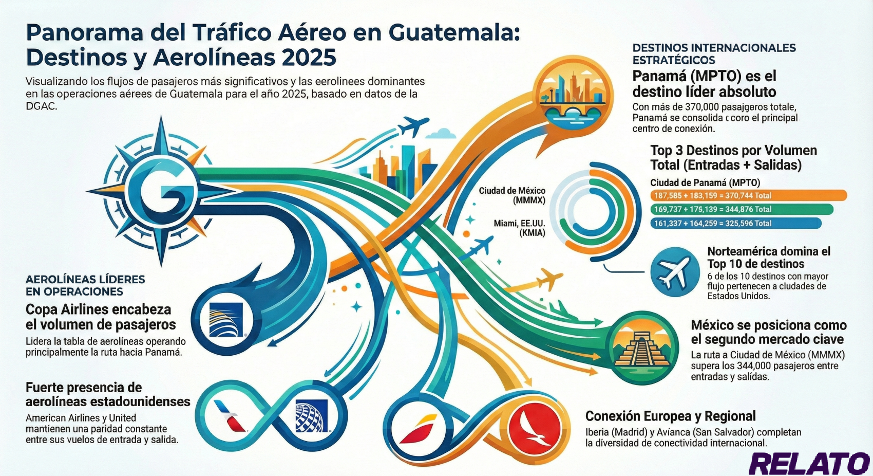 Para los guatemaltecos y visitantes, Panamá se mantuvo como el destino predilecto a través de Copa Airlines, liderando el top de aerolíneas con más de 187 000 pasajeros entrantes. Le siguieron de cerca rutas estratégicas hacia Estados Unidos, como Miami y Houston, y la conexión vital con la Ciudad de México.