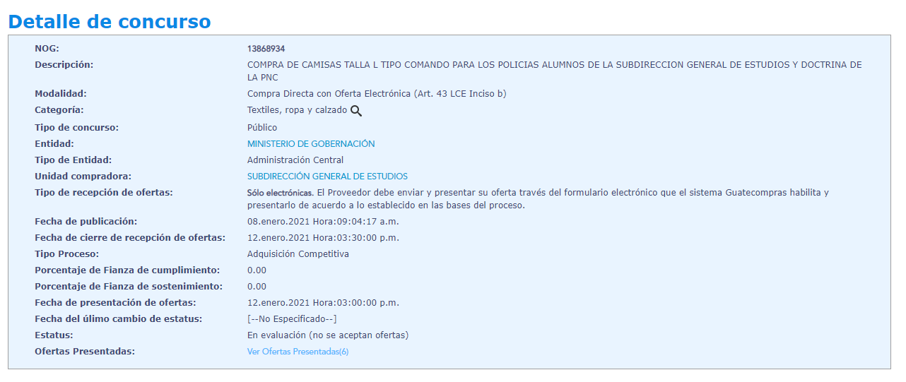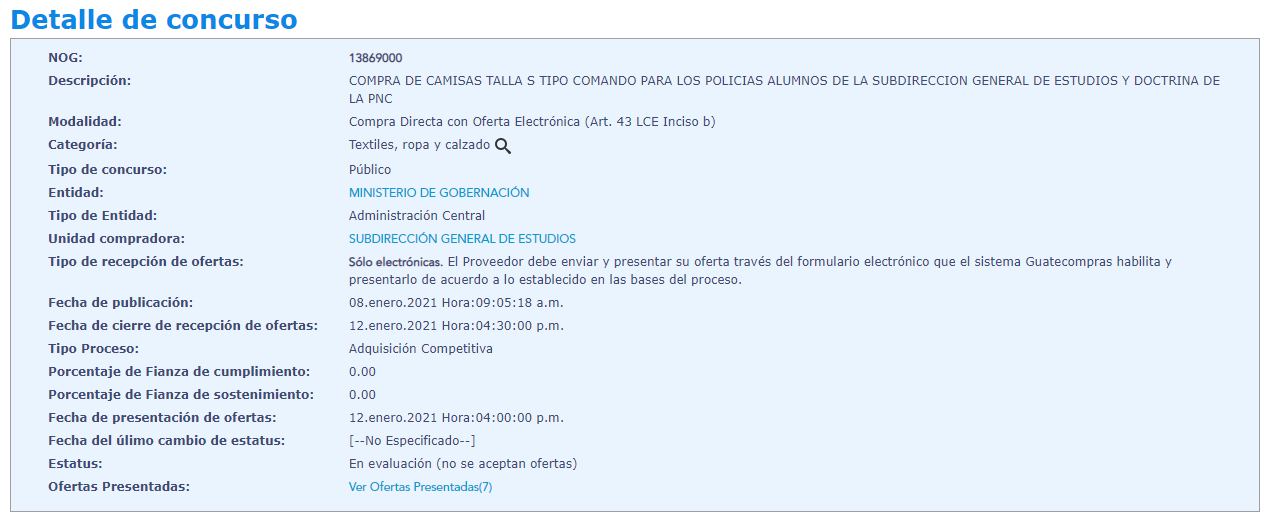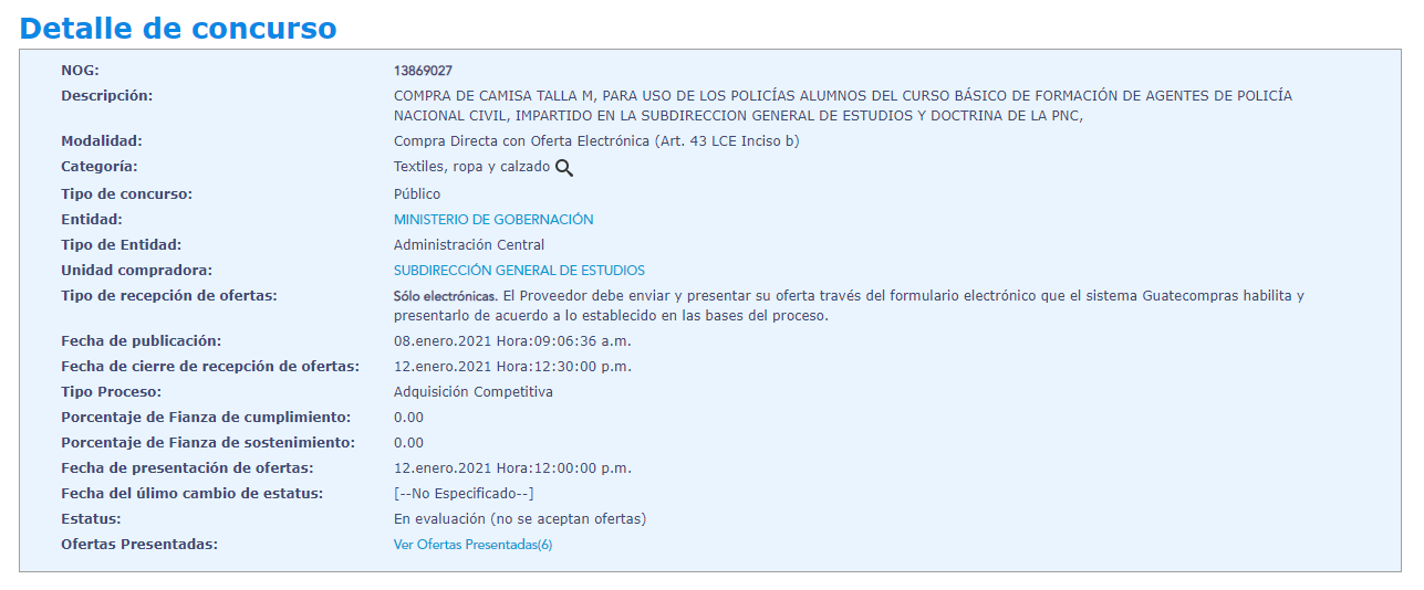 También está la compra de camisa talla M, para uso de los policías alumnos del curso básico de formación de agentes de policía nacional civil, impartido en la subdirección general de estudios y doctrina.
