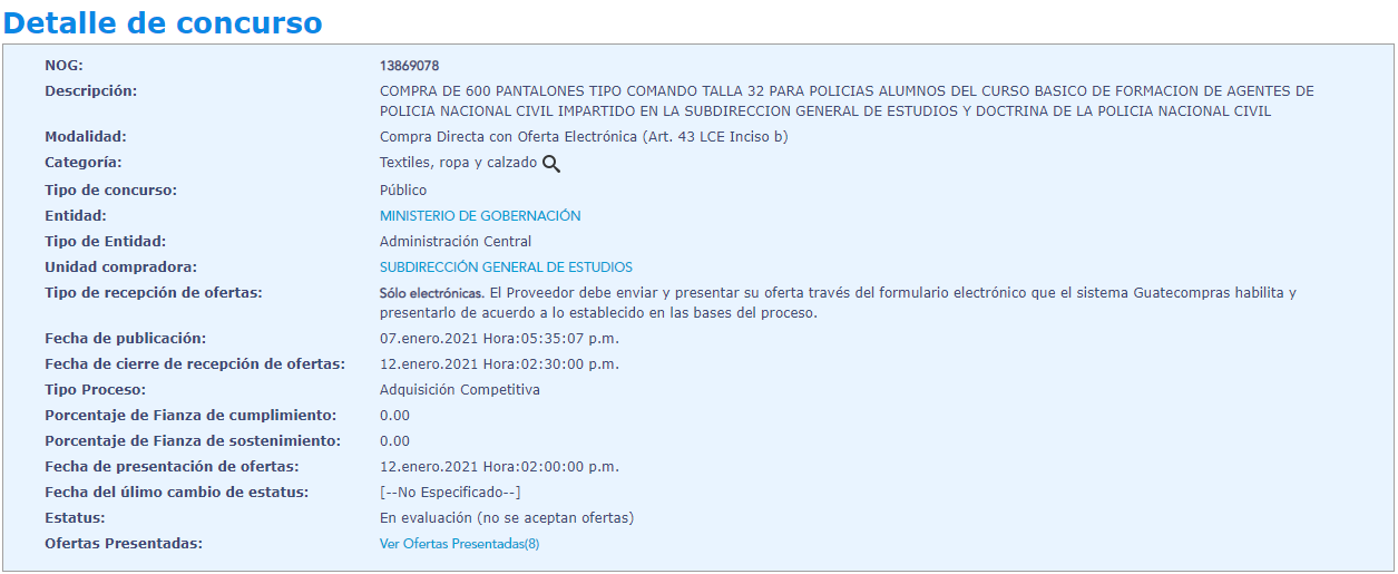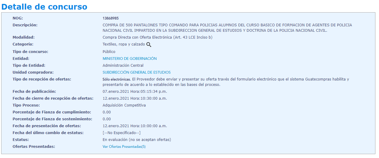 En el portal Guatecompras el Ministerio de Gobernación inicio a licitar la compra de varias prendas de vestir para los agentes de la Policía Nacional Civil, algunas de ellas han sido camisas y pantalones.